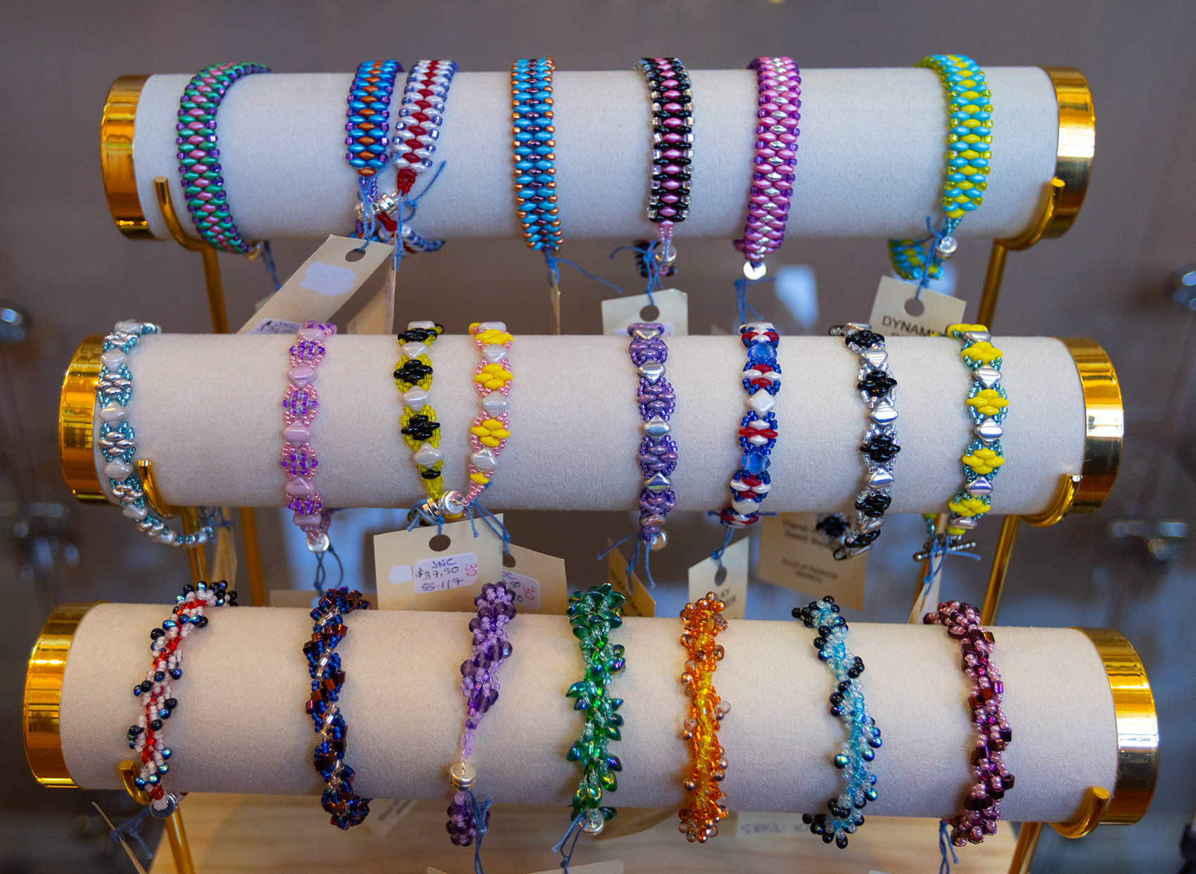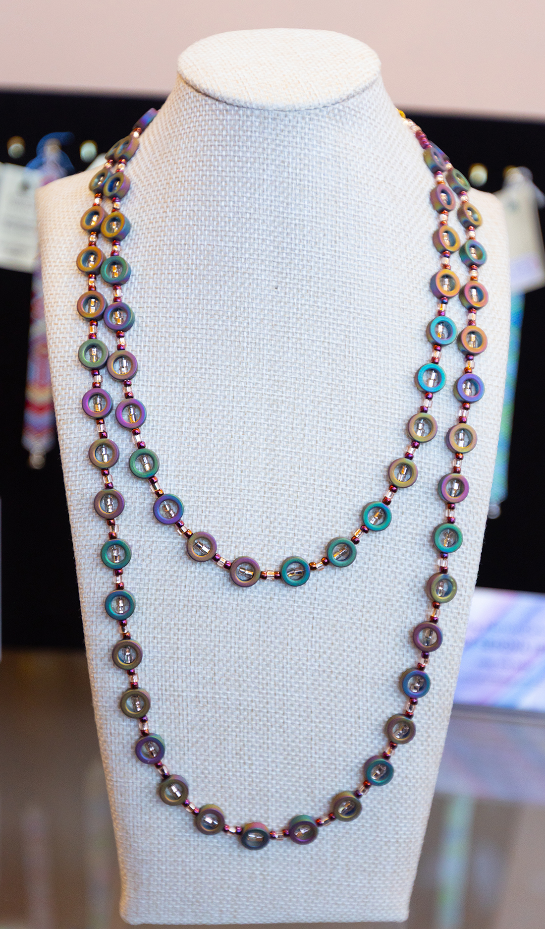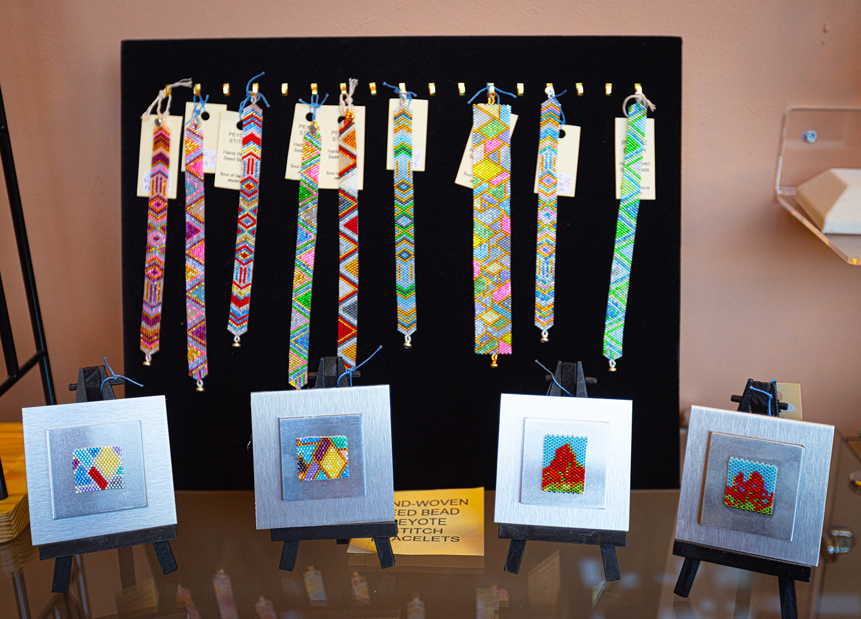 Norton-Cohen’s precise jewelry creations include gemstone beaded necklaces, gemstone chokers, energy bracelets, earrings, and peyote stitch seed bead bracelets. She also creates miniature landscape and abstract framed paintings using tiny beads.