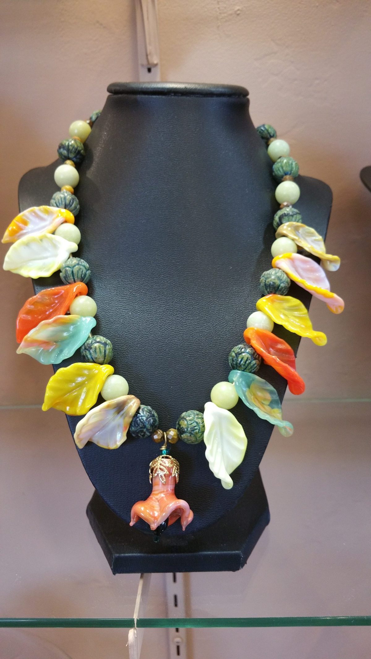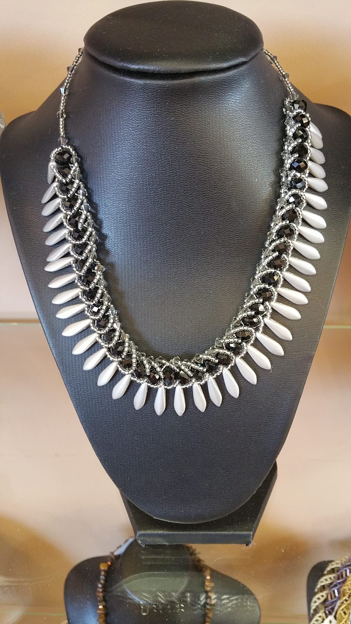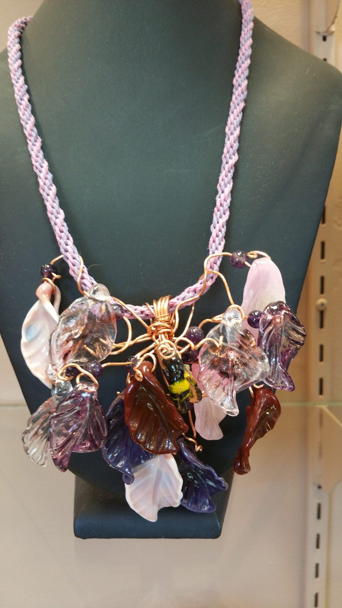 Ruth’s jewelry is most definitely eye-catching- from brilliant necklaces of multi-colored stone clusters to elegant spiral beaded neckware to miniature ‘under glass’ beaded dolls, earrings, and ‘shimmering beaded bracelets in every style imaginable, her artistry is unmatchable. She also makes custom jewelry and does repairs.
