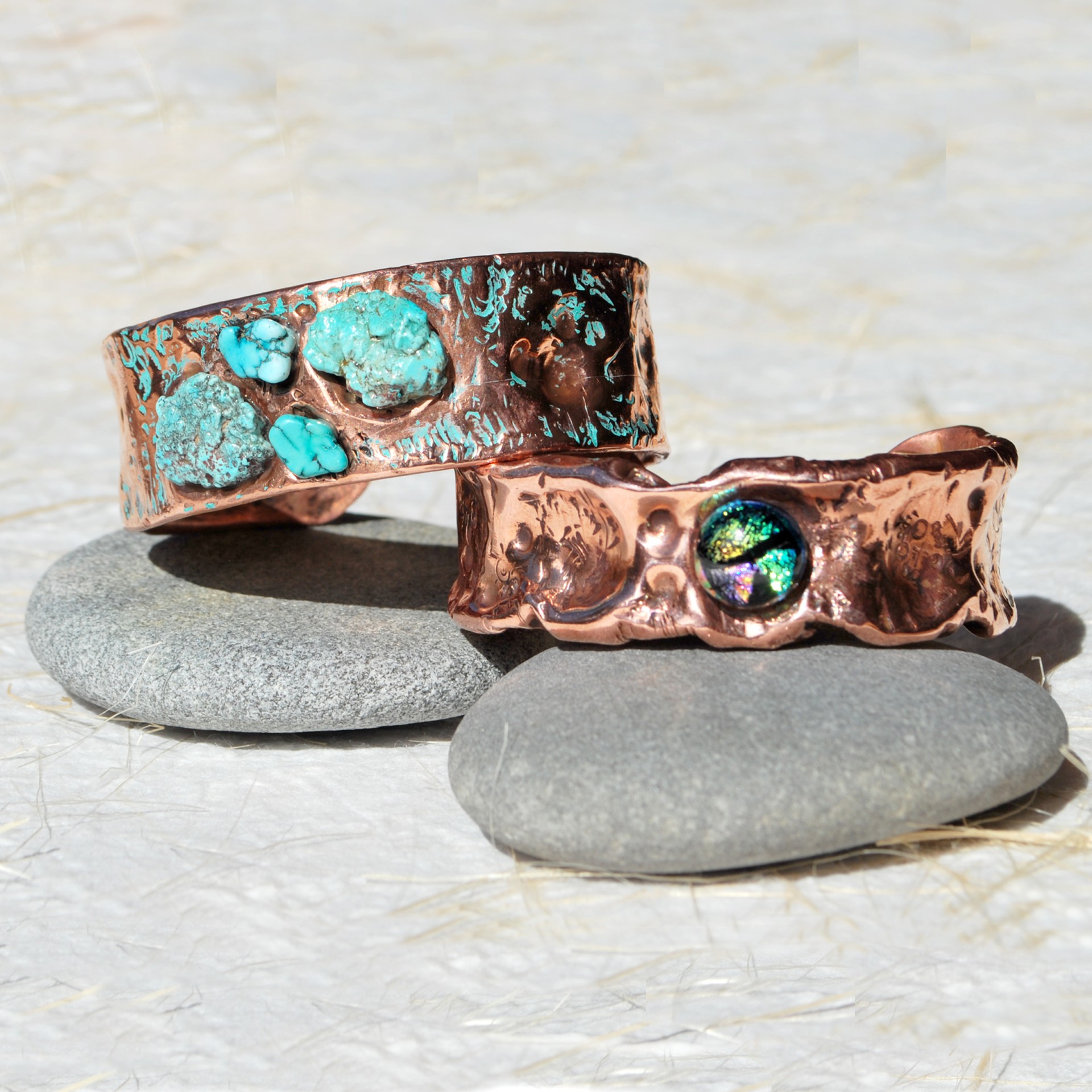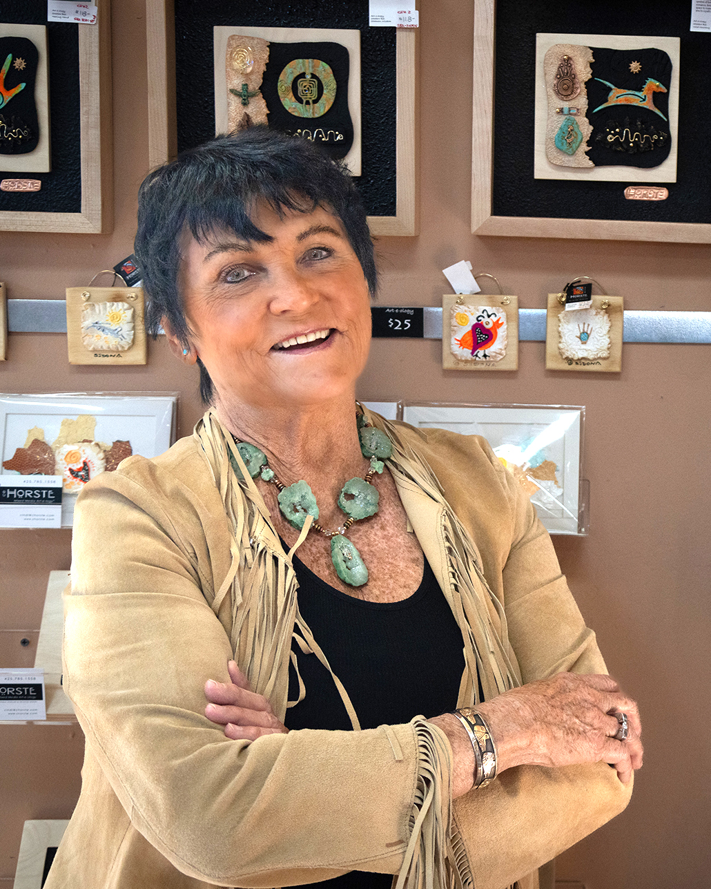 Taking “mixed media” to the outer limits, Horste applies assorted materials including wood, copper, clay, turquoise and exotic stones to her pieces. Another element at her disposal is “Spark Art” wood burning technique using 2K volts of electricity to create unique burn patterns that she later embellishes with turquoise inlay.