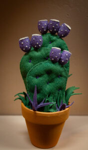 And as for her greatest artistic hurdles, “The bigger pieces can be a challenge in both form and palette. When I first started making the prickly pears it took a few to understand. . . how to make sure they weren’t wobbly in the pots. They needed more wiring.”