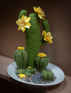 When asked about her favorite piece, she replies, “Actually, each piece I work on is the current favorite. I never truly know how each piece will turn out. . . Having said that, I will always gravitate toward making cactus pieces. They gave me my start and the combinations to put them together are endless.”