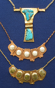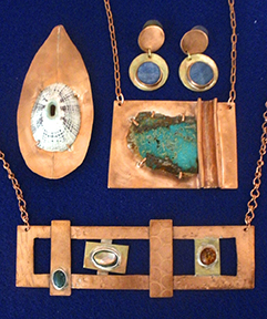 Like her buildings, Penny’s dynamic jewelry shows a variety of approaches and original designs. She produces one-of-a-kind pieces with variations on a theme as she explores fire, metal, and a variety of interesting cabochons. Penny frequently acquires stones and shells in her world travels in places such as Panama, China, Australia, and Russia as well as local turquoise from Arizona.