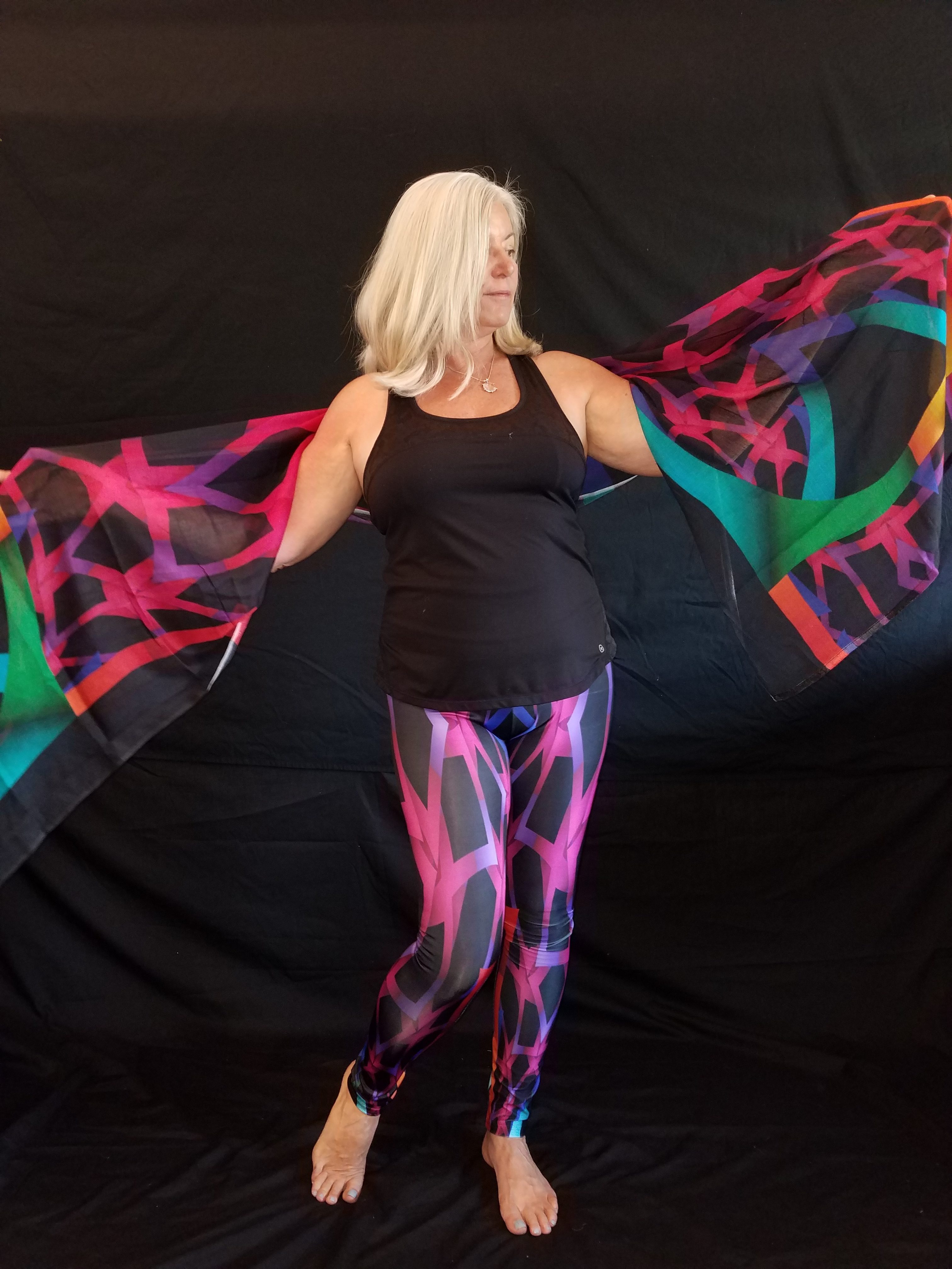 She is especially proud of her ‘community of friends’ which includes a company that offers material (made of recycled water bottles) on which her own original fractal art is printed. Her line of Yogis tights are worn by yoga fans, athletes, and fashion conscious women and men around the world. They are comfortable for any body shape and are undeniably elegant.