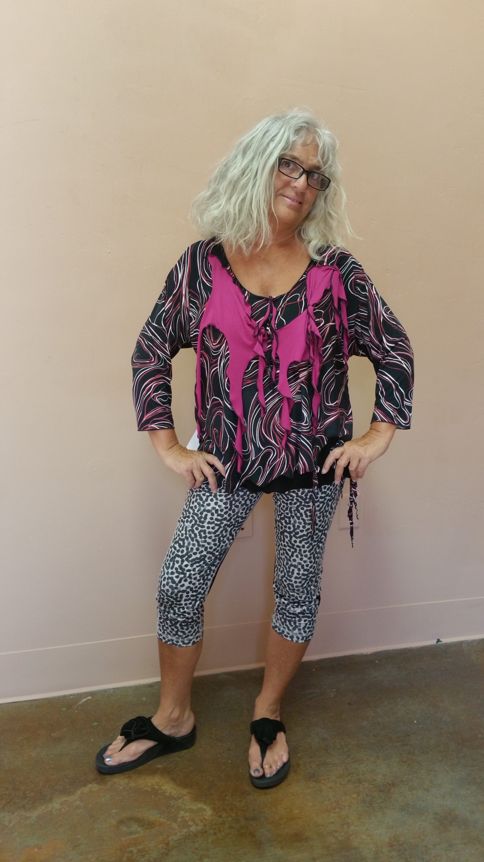 Suzen is well known for her popular line of “Wearable Art for the Ageless Goddess.” She describes herself as “a cloth artist- a fabric sculptress who carves and shapes unique designs from fun, easy care, and wrinkle-free fabrics.” Her tops, dresses, jackets, long coats, summer tops, and swimwear are casually elegant and subtly sensual. She also offers water bottle holders and wine carriers in her collection.