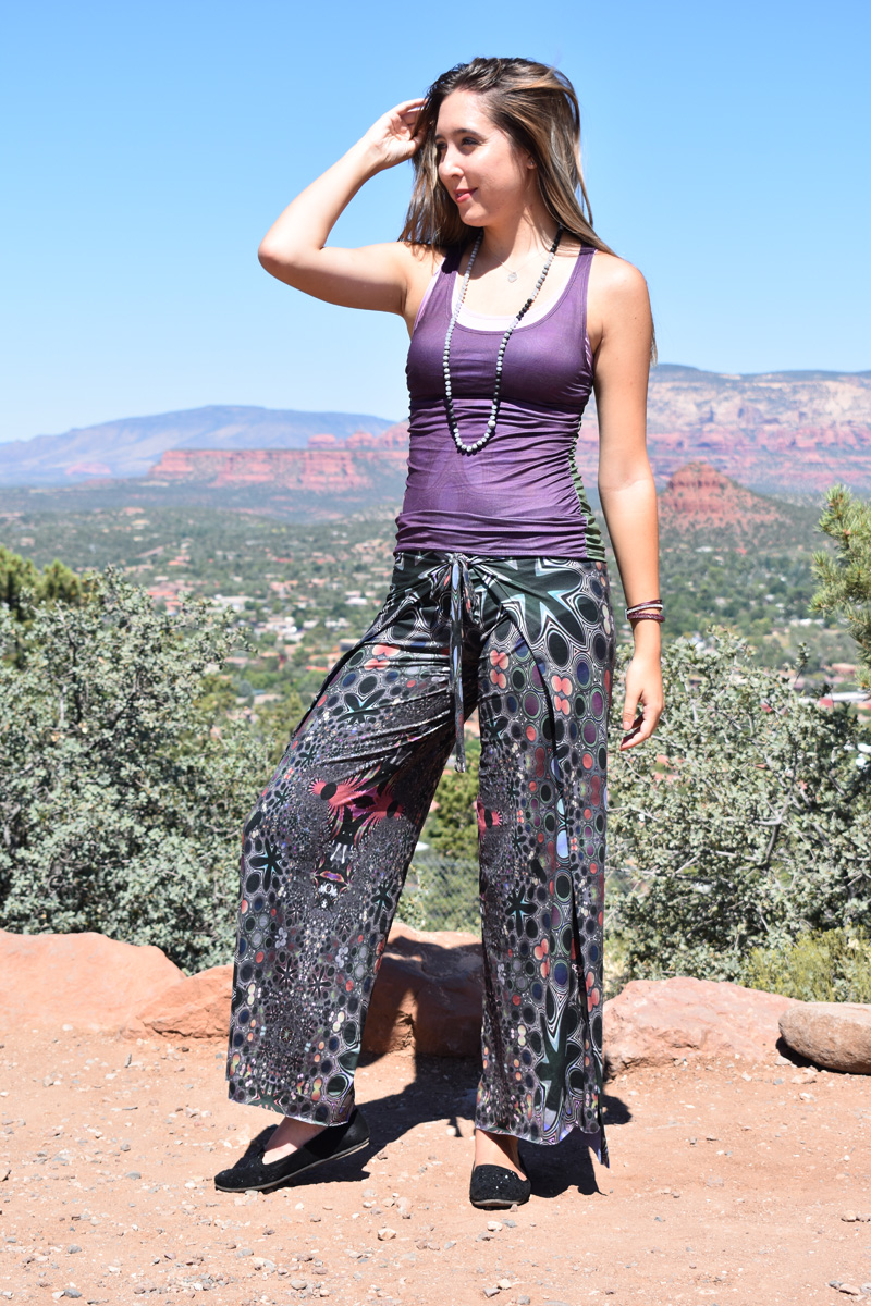 With a partner in Colorado, Nina creates the patterns for Yogi Yoga Wear leggings, tank tops, Wrap Around pants, and Hot Yoga booty shorts. A company in Scottsdale dyes and sews the pieces together, but it is Nina who painstakingly places the fractal designs onto each pattern according to the size, shape, and body type before final production. She is constantly developing and adding new designs. In her words, “I have always played with COLOR, TEXTURE and MOVEMENT- colorful patterns and geometric designs that reflect the symmetry of life.”