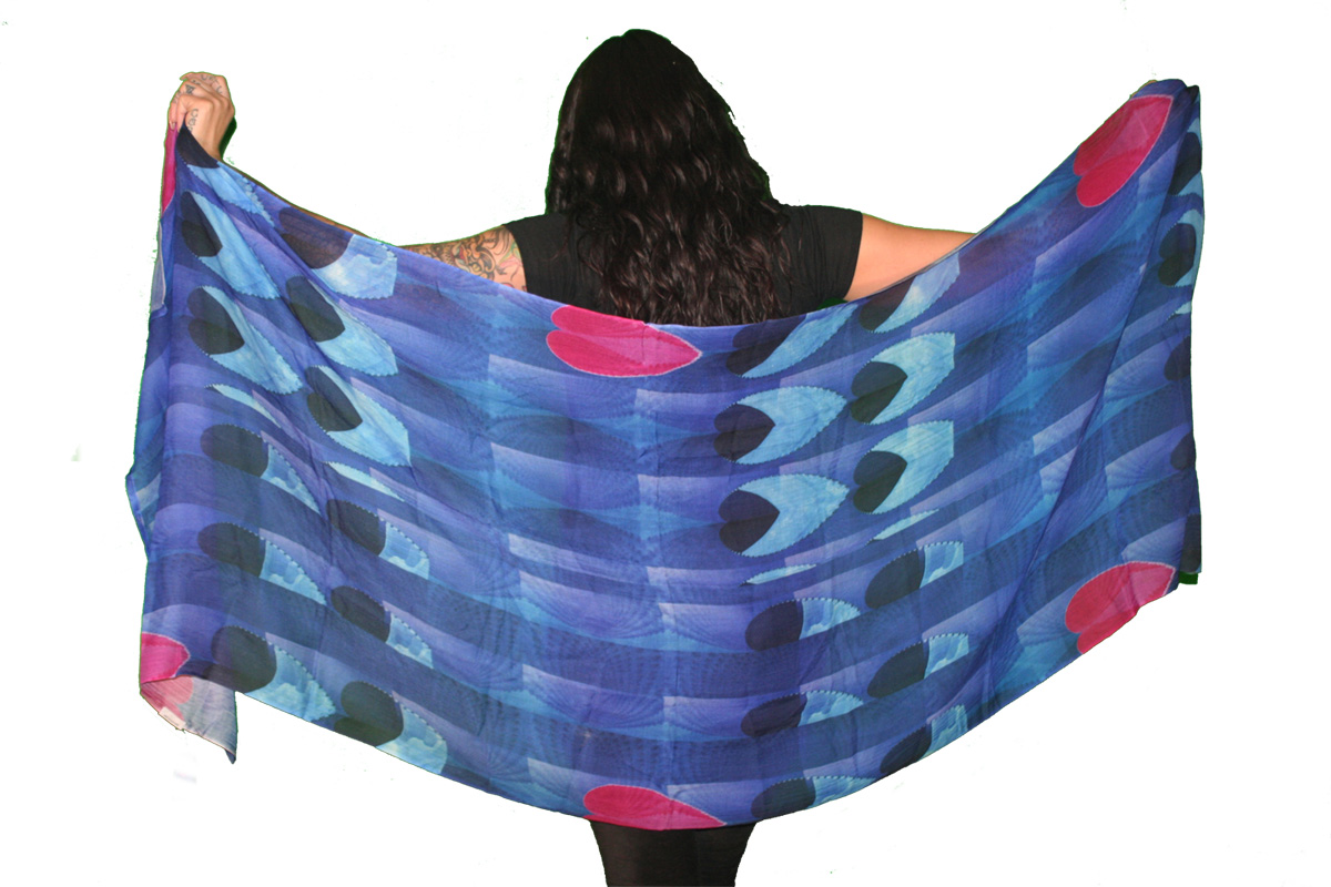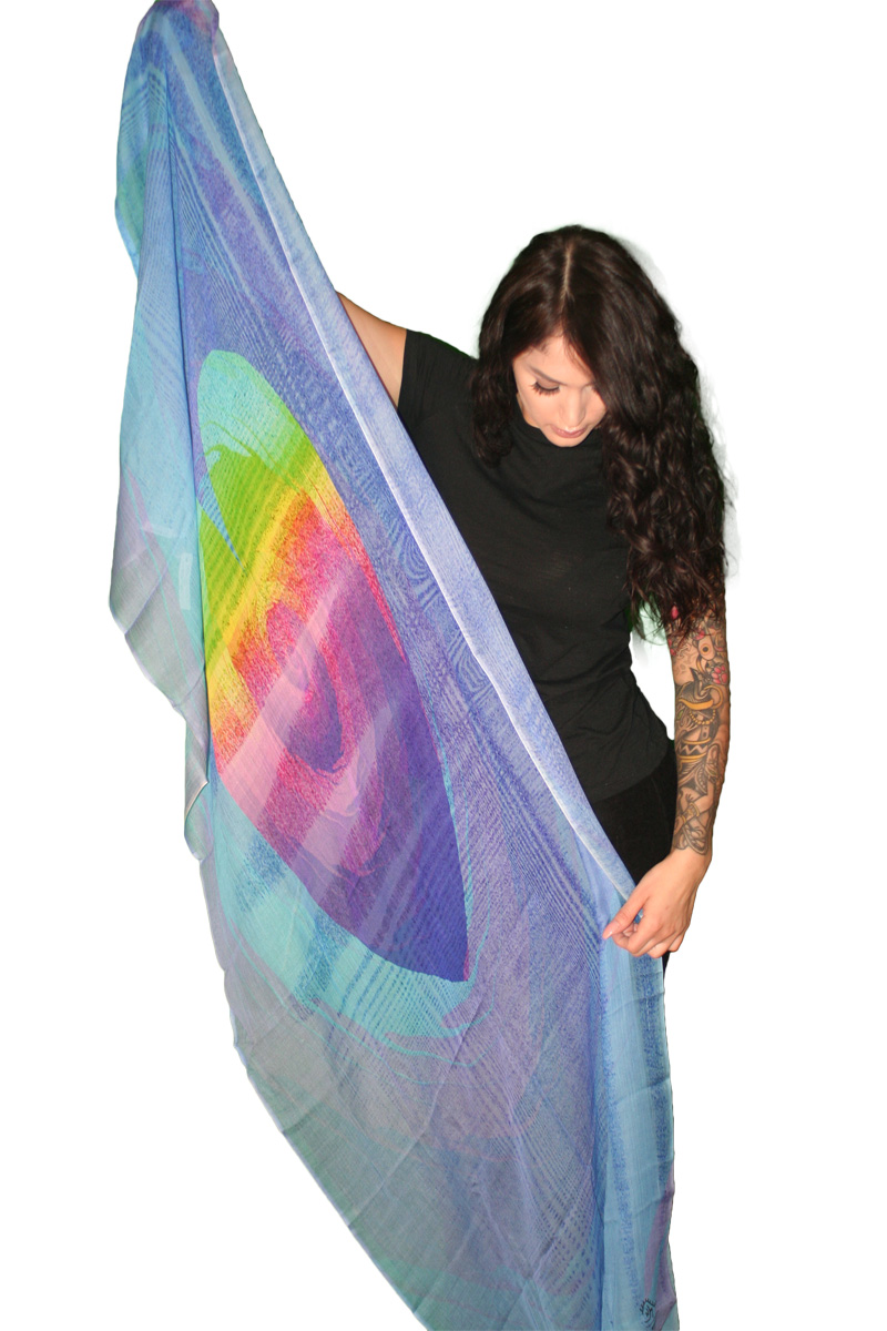 Six years ago, Nina’s endeavors propelled her into the world of textiles and “Art You Wear.” Dedicated to an eco-friendly lifestyle, Nina began to combine her fractal designs with yoga wear that would be comfortable, sustainable, and beautiful. Her first designs were large, eye-catching brilliantly colored and very functional scarves made from strands of the Beachwood plant which produce a silk-like texture. To expand her yoga line, she began the search for an American company that produced eco-friendly fabric and discovered, “the world’s largest recycling company” which cleans the toxic chemicals from plastic and recycles the plastic into threads. When woven with lycra or spandex, the resulting fabric is unlike any other in sustainable quality.